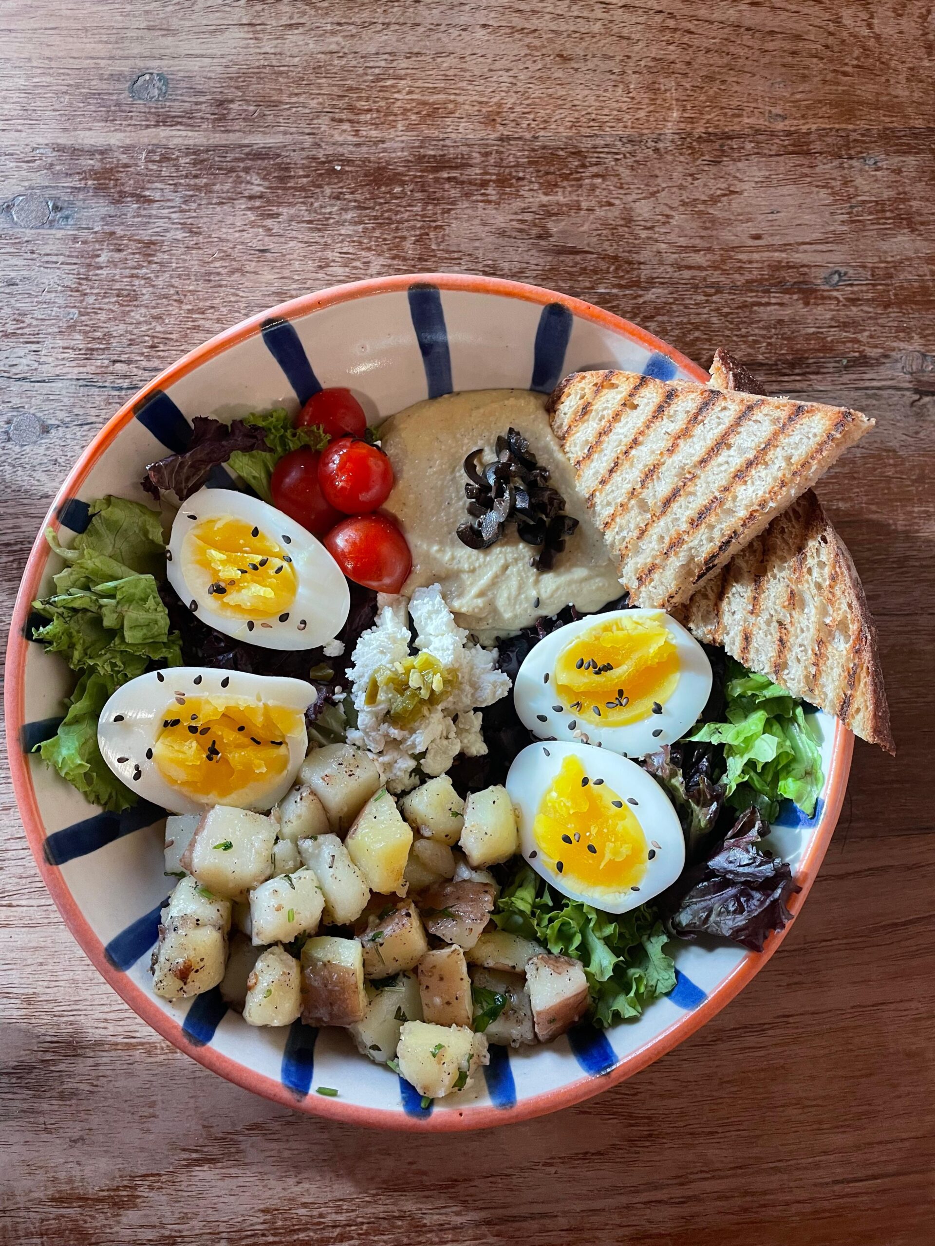 Egg, Hummus, Crispy Potatoes, Salad leaves, Feta, Olives
