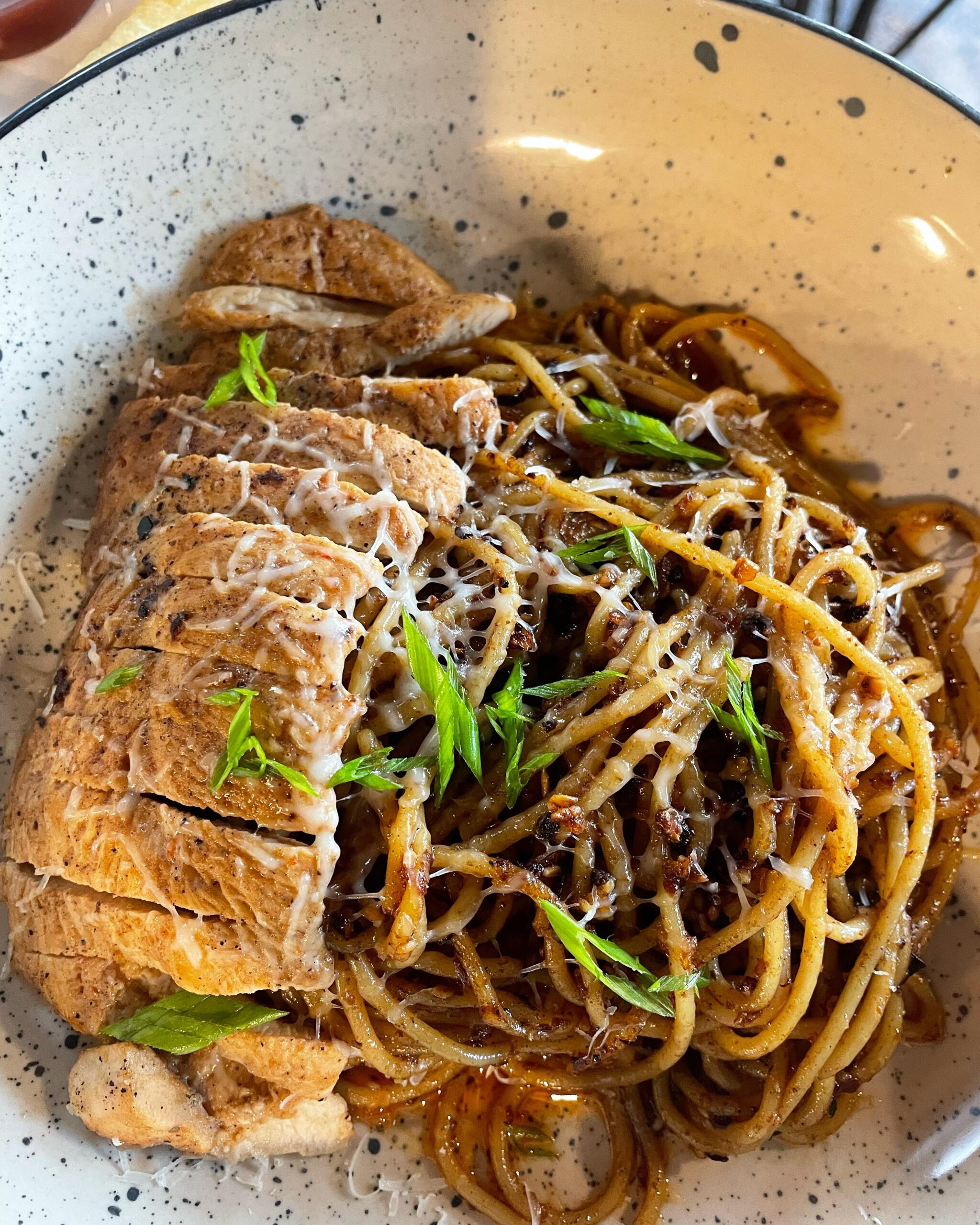 Spicy chicken and savory chili oil noodle dish, honey
