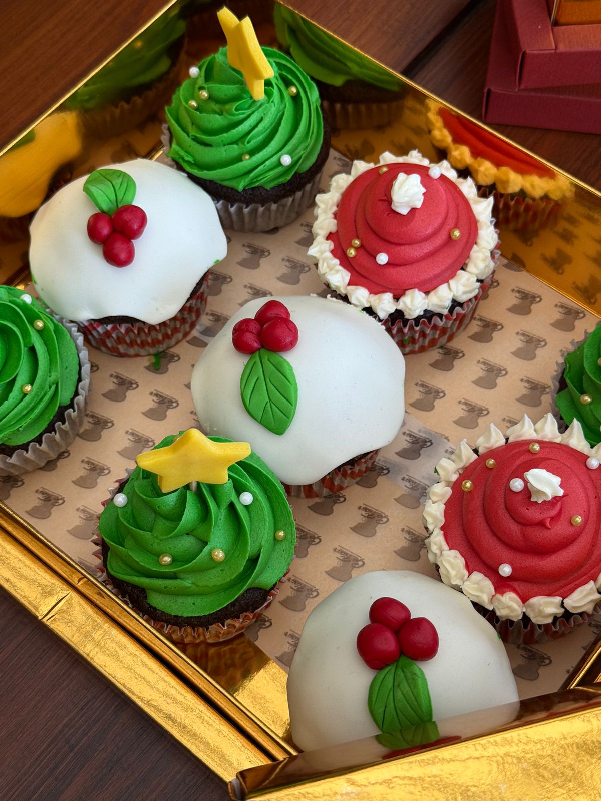 Beautiful gold box full of delicious seasonal cupcakes