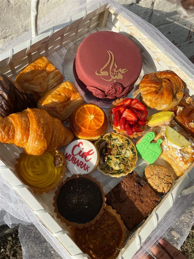Our Eid Special Basket is a combination of our best-selling sweet and savoury items:1 Eid Special Bento Cake2 Chicken Pattie1 Orange Upsidedown1 Apple Crumble 1 Toffee Walnut1 Lemon Tart 1 Honeynut Tart1 Chocolate Tart1 Strawberry Tart1 Cinnamon Roll1 Plain Croissant1 Chocolate Criossant1 Spinach & Mushroom1 Fudge Brownie3 Eid Special Cookies